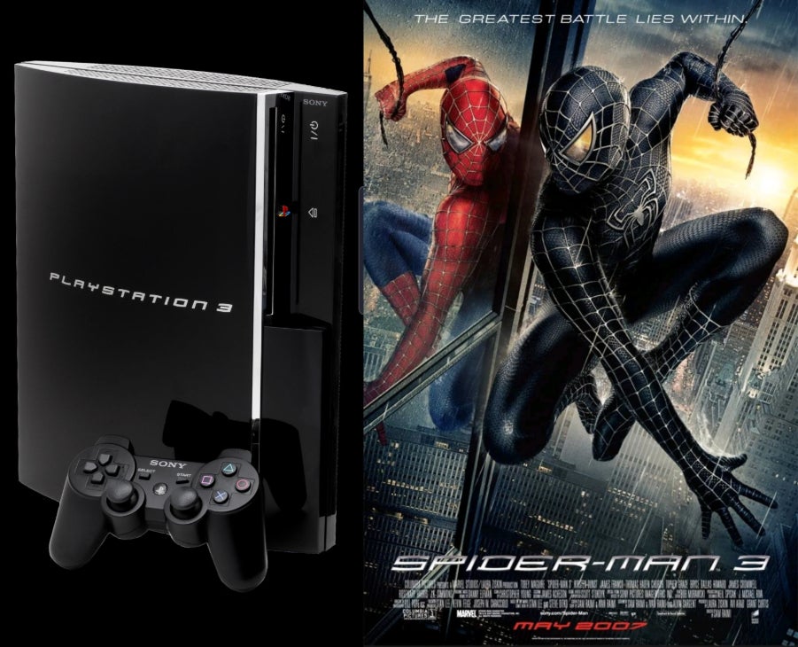 No anúncio do PlayStation 3, que demonstrava seu poder e capacidade de reproduzir Blu-rays, a Sony usou imagens do Homem-Aranha para fazer essa referência. Mas esse nem era o motivo da estranha combinação: Teiyu Goto, designer-chefe da Sony Computer Entertainment, defendeu veementemente a decisão, afirmando que era a escolha certa, pois combinava perfeitamente com a curvatura e a aparência do console. Ele não estava sozinho nessa opinião, como o próprio Goto declarou algum tempo depois.